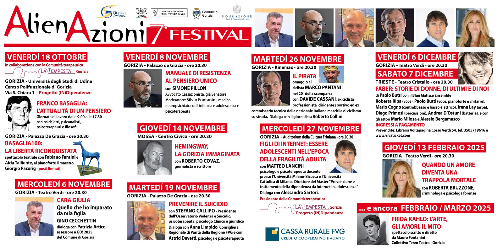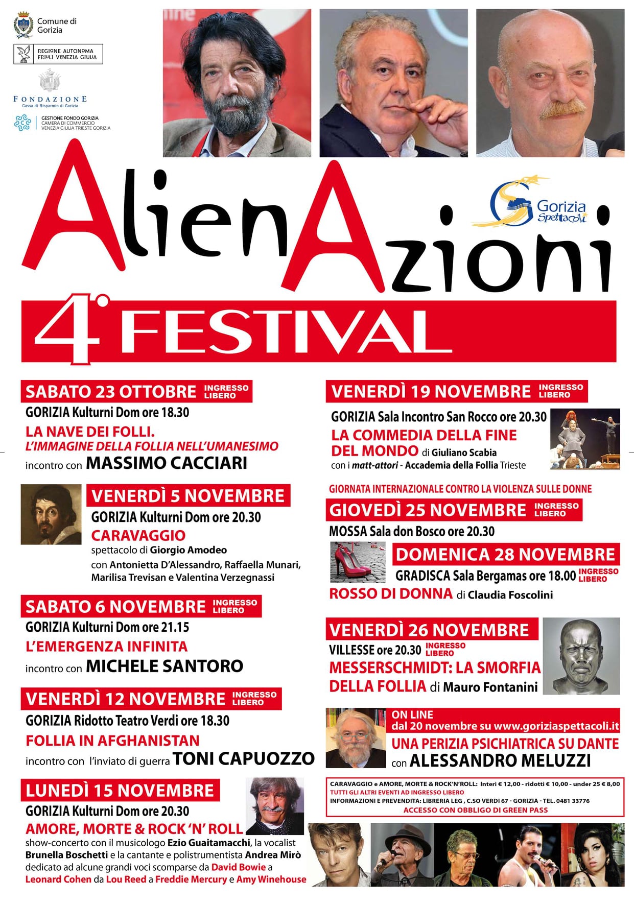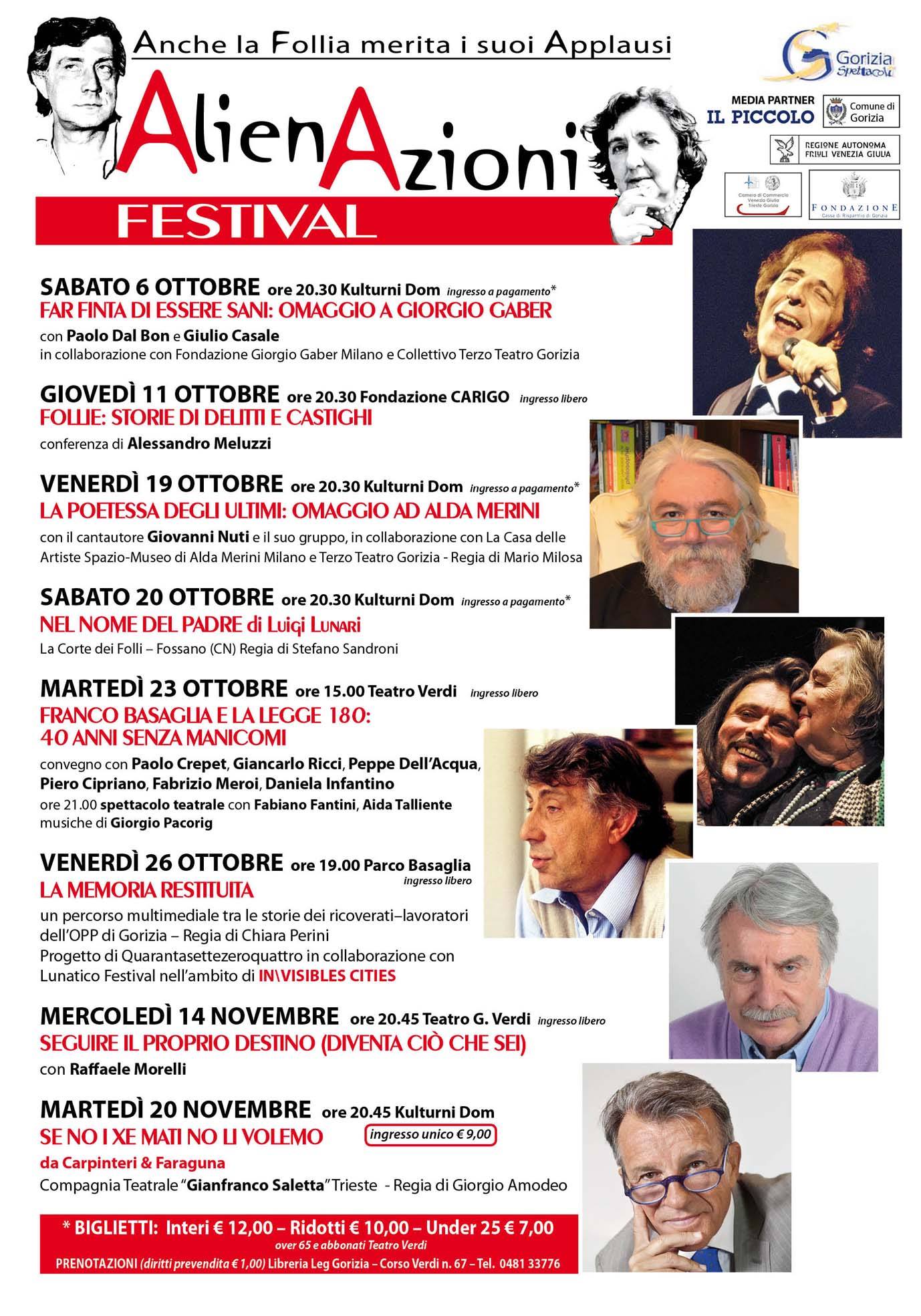 Organizzata dall’associazione Gorizia Spettacoli, il festival AlienAzioni vuol compiere, e, soprattutto, far compiere, un ideale viaggio tra la follia e le nevrosi dell’oggi attraverso spettacoli e incontri con esperti del settore appartenenti a mondi differenti: psichiatri, psicoterapeuti, scrittori, giornalisti, filosofi, giuristi, storici.