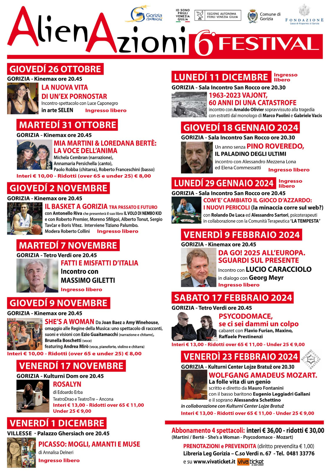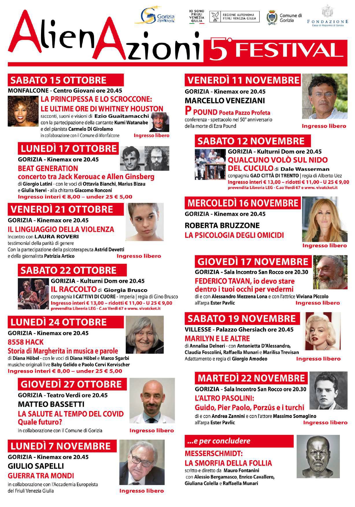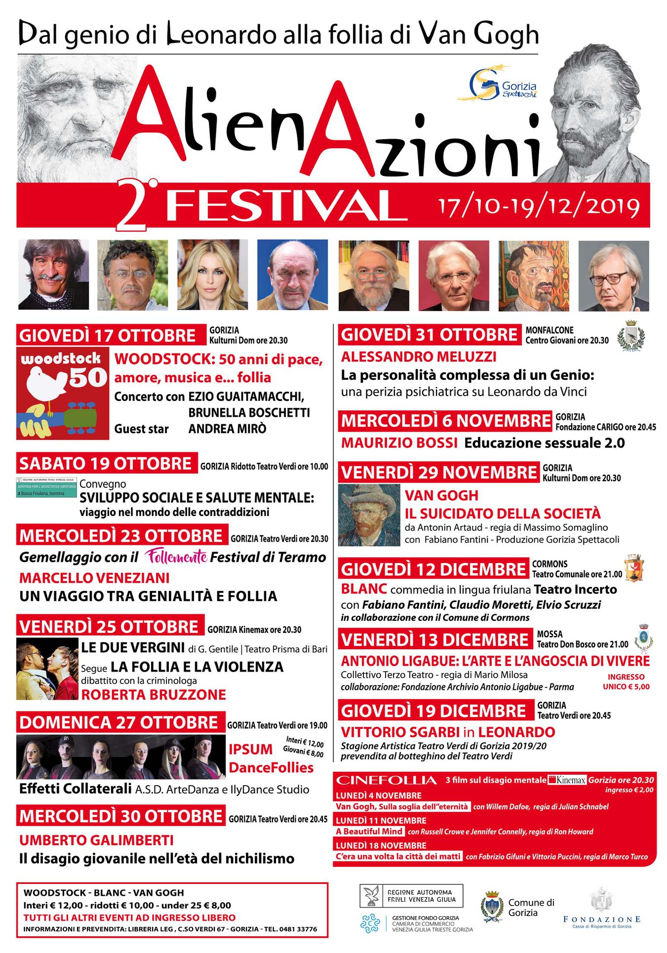 Organizzata dall’associazione Gorizia Spettacoli, il festival AlienAzioni vuol compiere, e, soprattutto, far compiere, un ideale viaggio tra la follia e le nevrosi dell’oggi attraverso spettacoli e incontri con esperti del settore appartenenti a mondi differenti: psichiatri, psicoterapeuti, scrittori, giornalisti, filosofi, giuristi, storici.